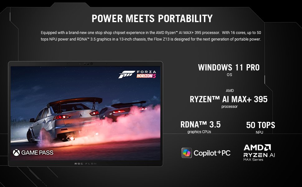 • POWER MEETS PORTABILITY – Equipped with a brand-new one stop shop chipset experience in the AMD Ryzen AI MAX+ 395 processor. With 16 cores, up to 50 tops NPU power and RDNA 3.5 graphics in a 13-inch chassis, the Flow Z13 is designed for the next generation of portable power.