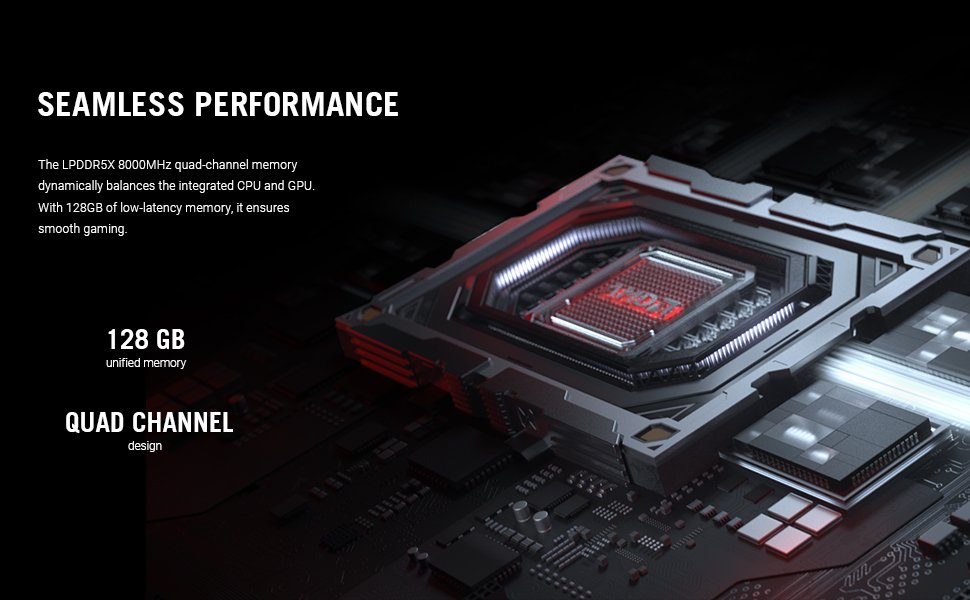 • SEAMLESS PERFORMANCE – The LPDDR5X 8000MHz quad-channel memory dynamically balances the integrated CPU and GPU. With 128GB of low-latency memory, it ensures smooth gaming.