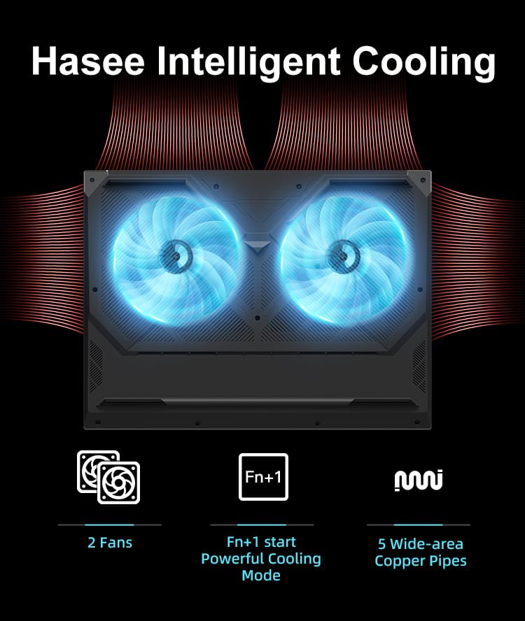 Cooling System: Hasee Intelligent Cooling Technology (2 fans, 5copper tubes, 4 air vents)