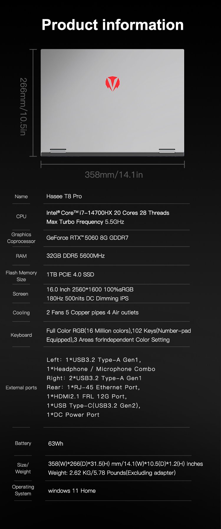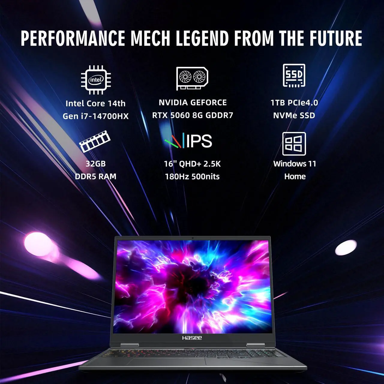 Hasee T8 Pro-16” GeForce RTX 5060 Laptop GPU, Intel i7-14700HX-5.5GHz, AI Ready Gaming Laptop, 32GB DDR5 RAM, 1TB SSD, 16” 180Hz QHD 100%sRGB IPS, RGB KB, WiFi7,BT5.4,Win11 Home