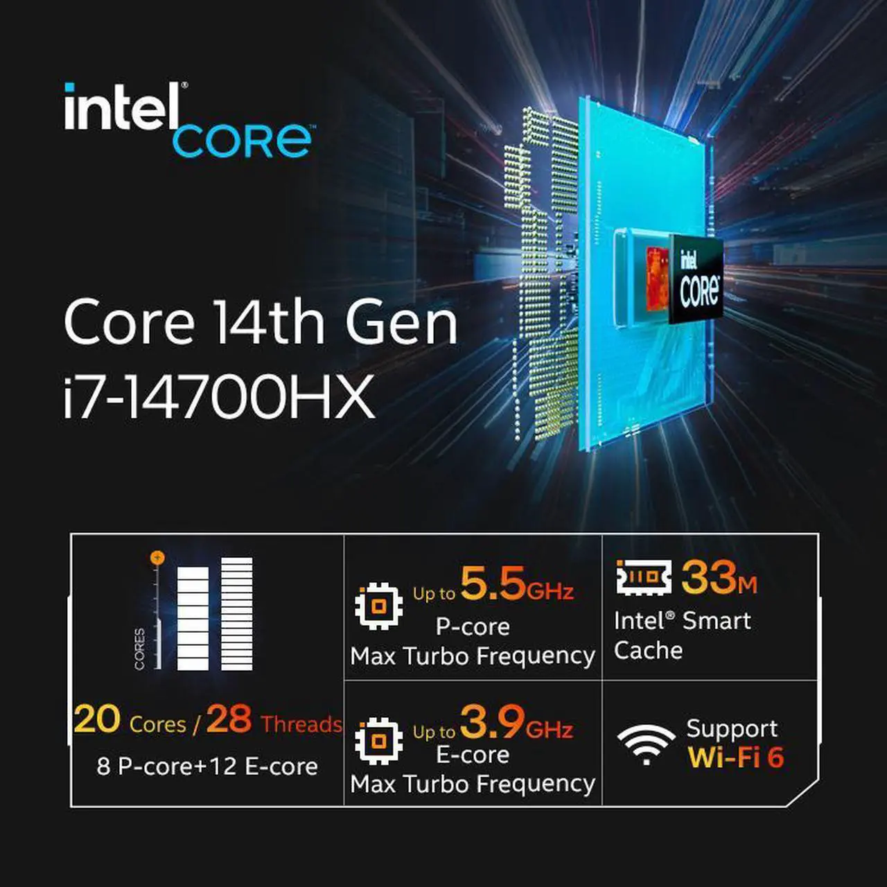CPU: Intel Core i7-14700HX, 20 Cores (8 Performance-cores, 12 Efficient-cores) & 28 Threads
