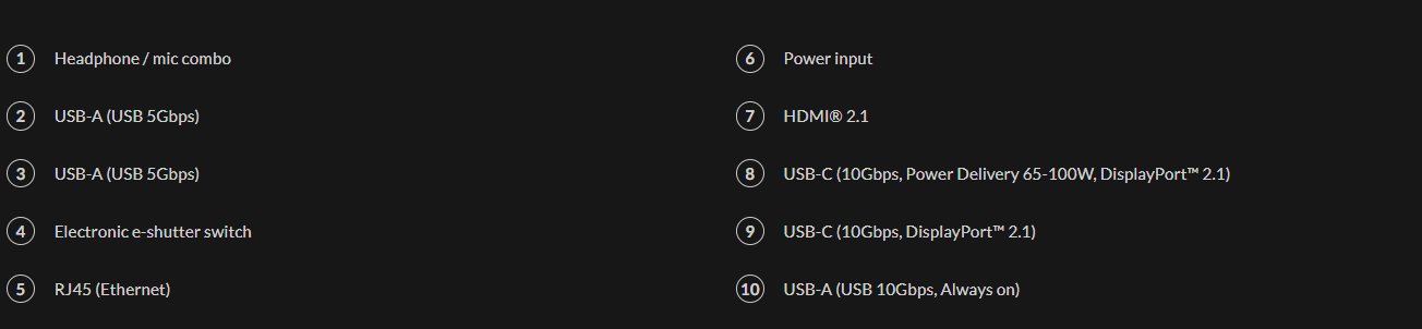 - USB-C (10Gbps, Power Delivery 65-100W, DisplayPort 2.1)