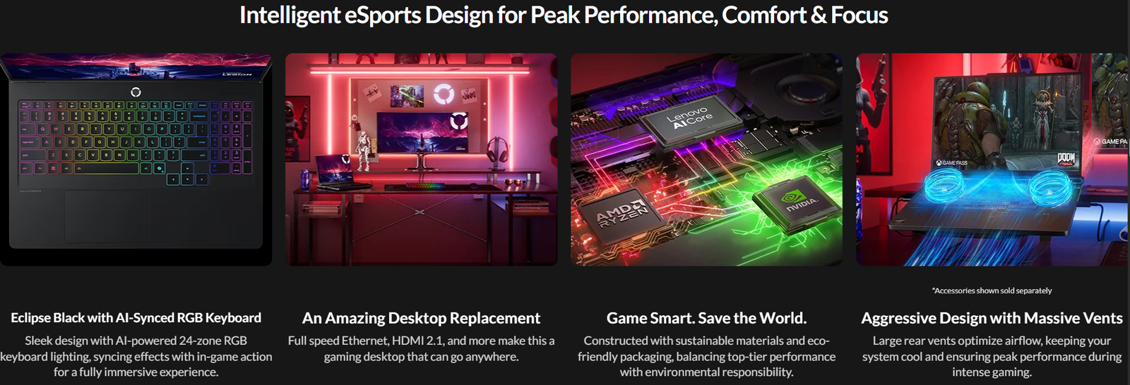 The Legion Pro 5 keeps cool with massive rear vents, ensuring optimal airflow and comfort during gaming. Its Eclipse Black finish, AI-synced RGB keyboard, and durable build create an immersive, sustainable design. Packed with Ethernet, HDMI 2.1, and an eShutter webcam, it is a powerful desktop replacement built for competitive play.