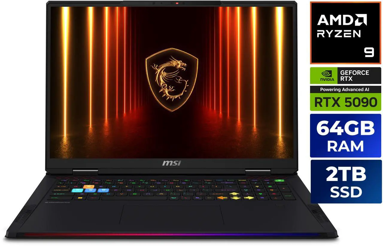 MSI Raider – 18″ GeForce RTX 5090 Laptop GPU – AMD Ryzen 9 9955HX3D – 64GB DDR5 5600MHz Memory – 2 TB SSD – Wi-Fi 7 Windows 11 Pro – Gaming Laptop – 120 Hz Mini LED (Raider A18 HX A9WJG-052US )